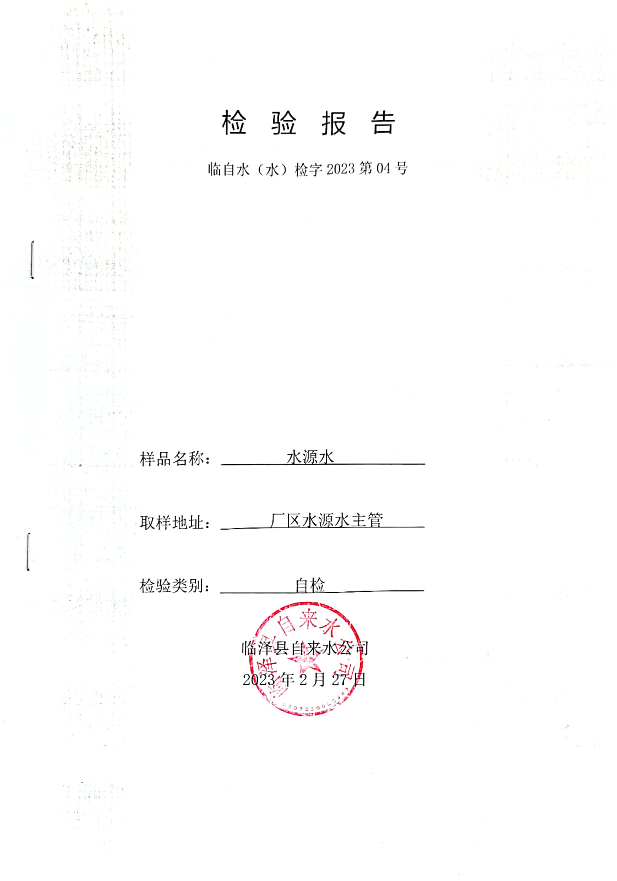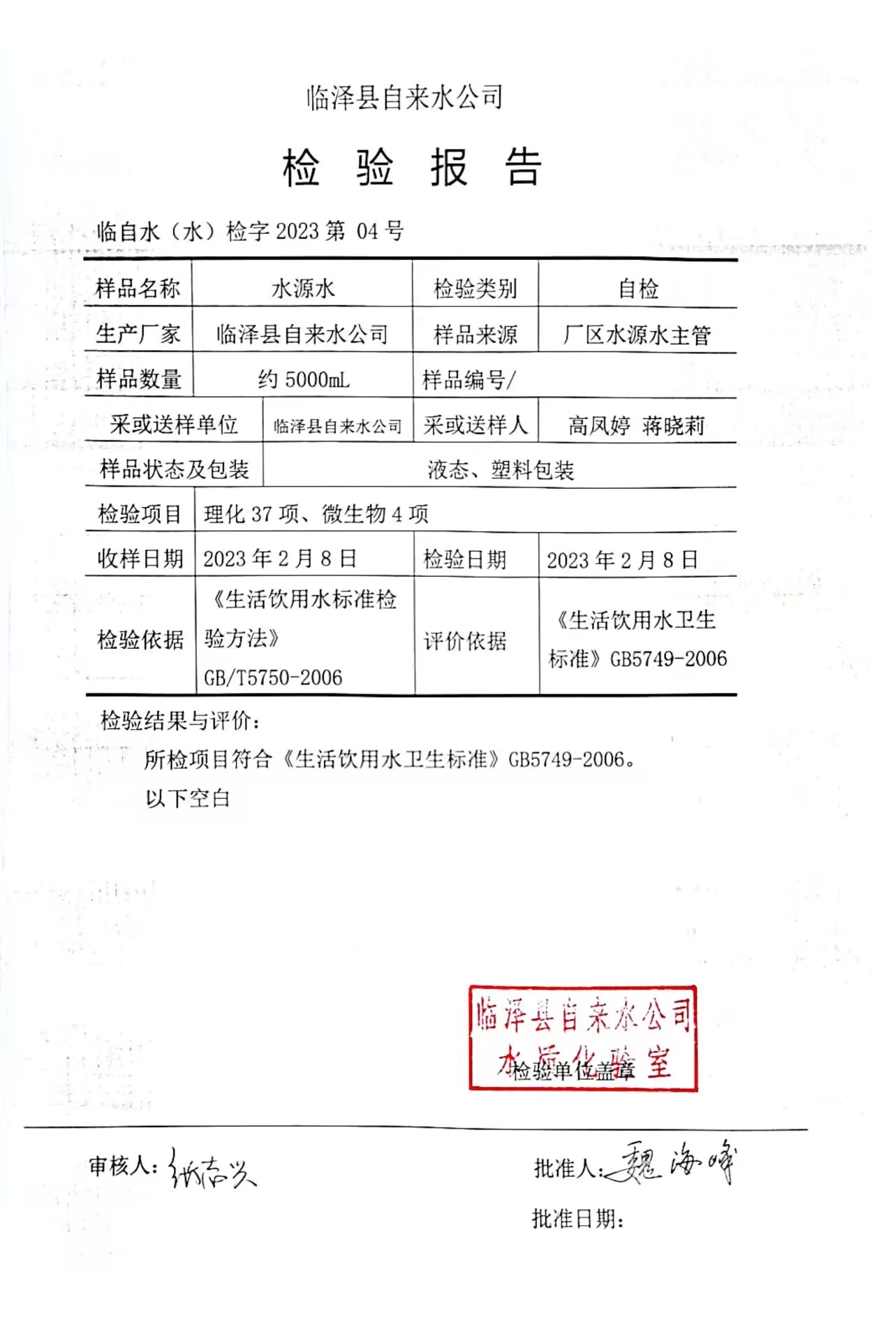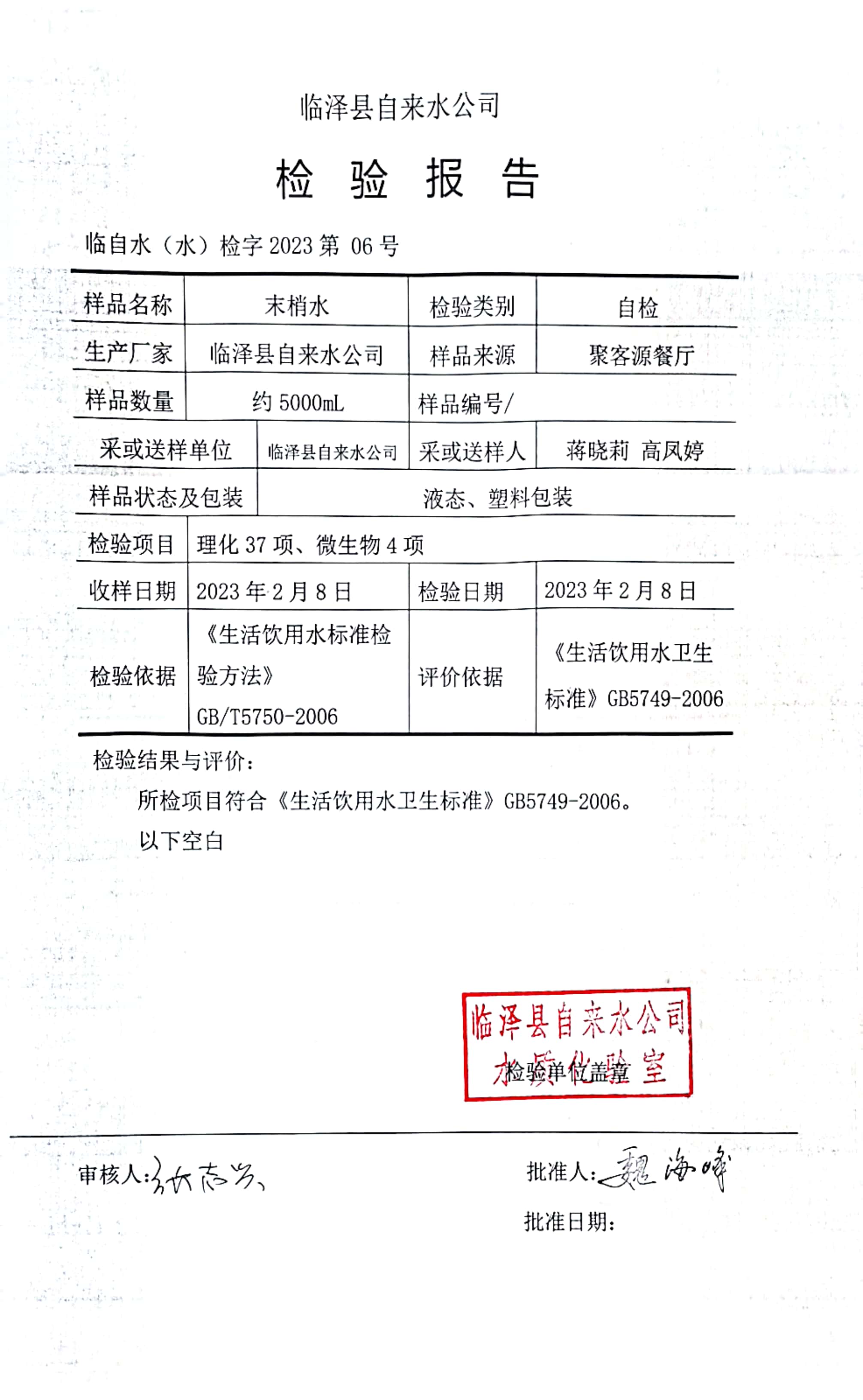2023年2月临泽城市供水生活饮用水水质检测结果