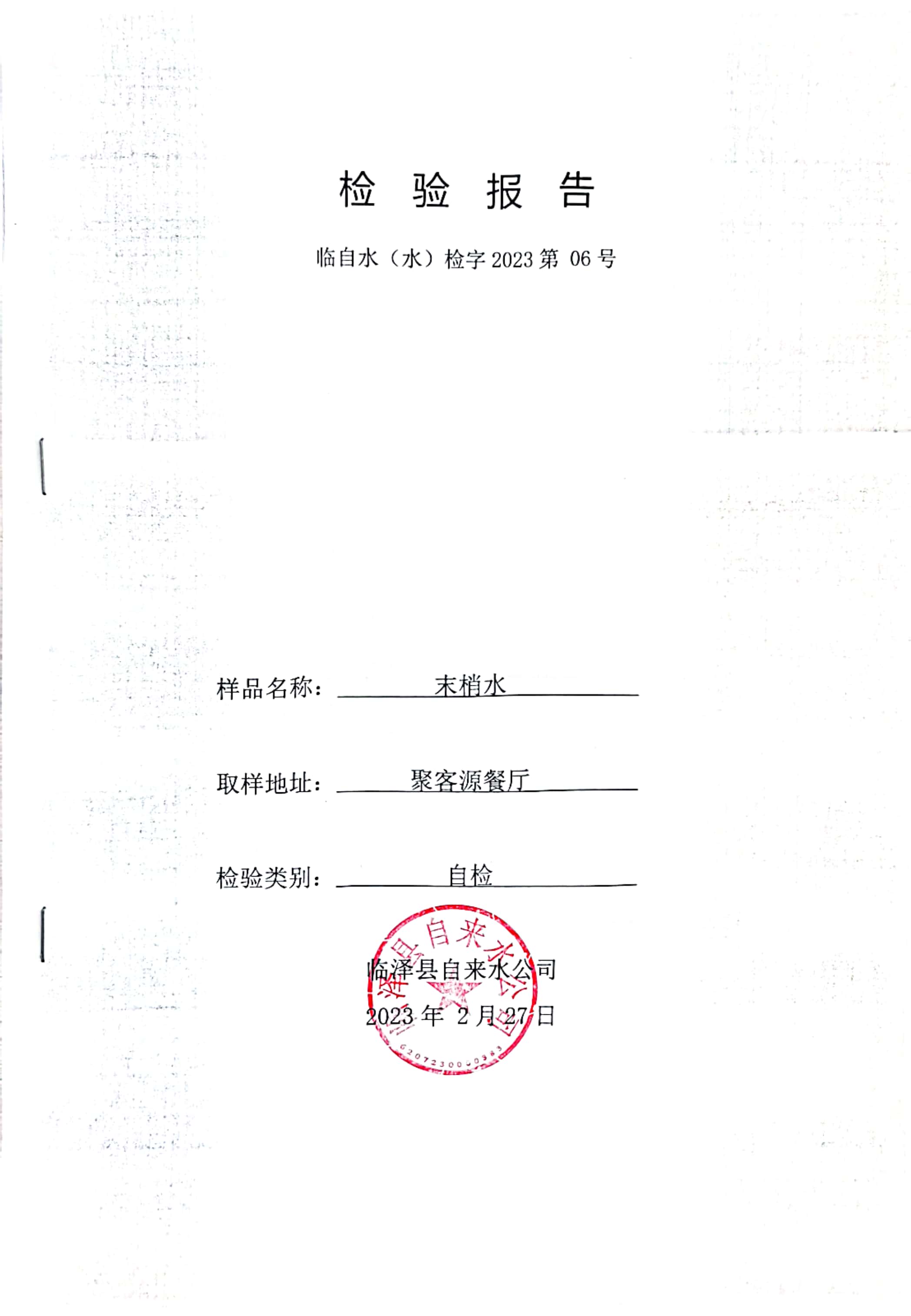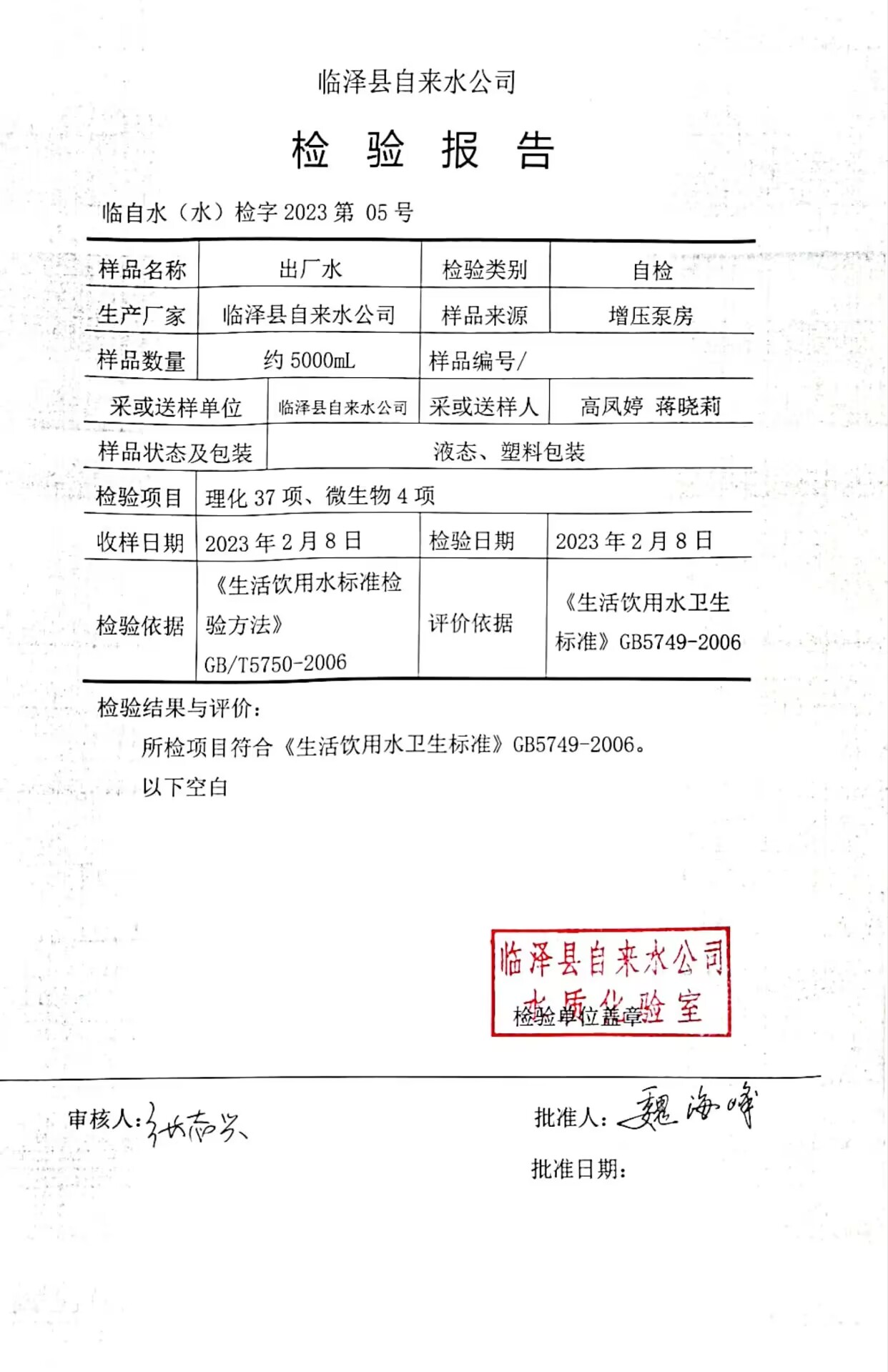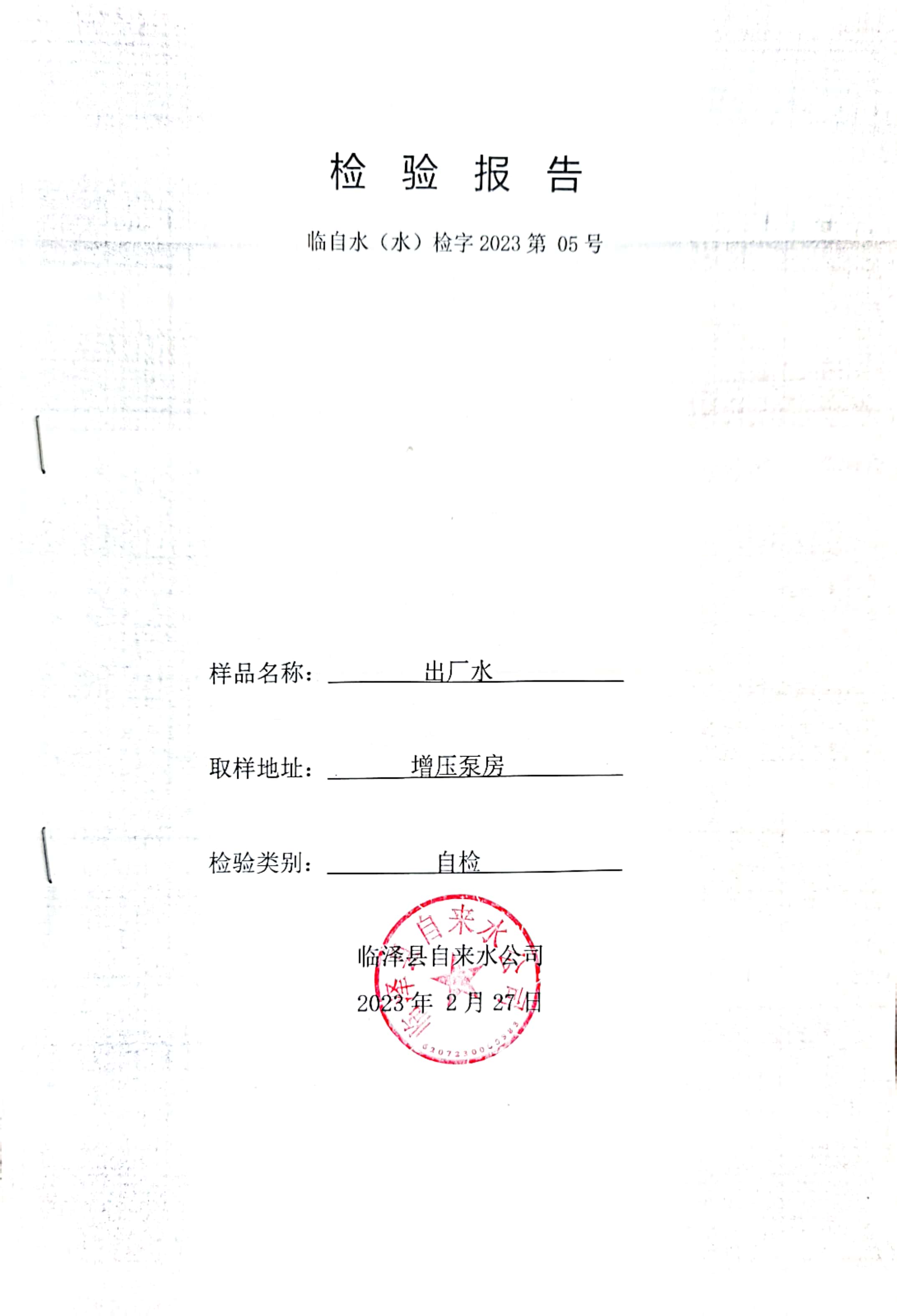 2023年2月临泽城市供水生活饮用水水质检测结果